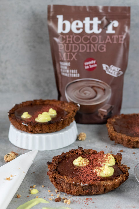 Šiam receptui naudojome naują šokoladinį pudingą be glitimo Bettr. Tai puikus priedas prie beveik bet kokio deserto. Tai netgi gali sugrąžinti vaikystės prisiminimus apie šiltus, kreminius pudingus, pagamintus jūsų mamos ar močiutės. Ir geriausia dalis? Šokoladinis pudingas paruošiamas vos per 1 minutę!